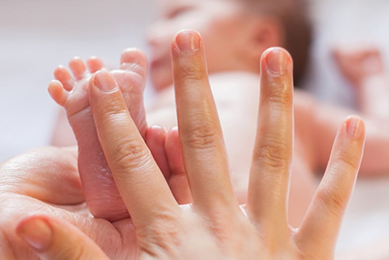 With one hand, gently hold your baby’s ankle. Place your other hand at the top of your baby’s thigh, molding it around the leg, then slide it to the ankle. Repeat with firm yet gentle rhythmic strokes, one hand after the other.